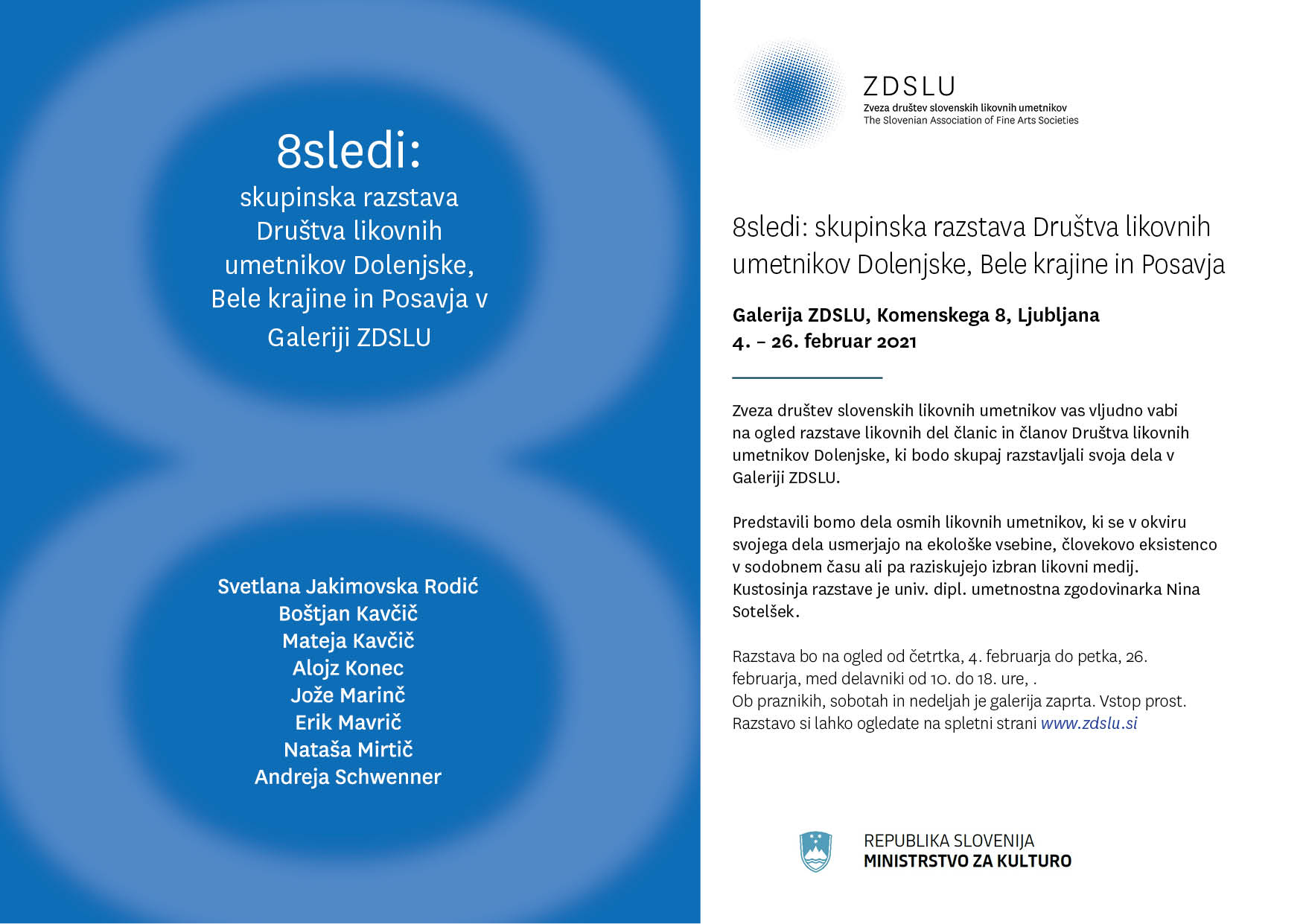 Vabljeni v Galerijo ZDSLU, kjer si lahko od 4. 2. pa do 26. 2. 2021 v živo!! ogledate našo razstavo. Galerija je odprta od torka do petka med 14,00 in 18,00, ob sobotah med 10,00 in 13,00 uro.