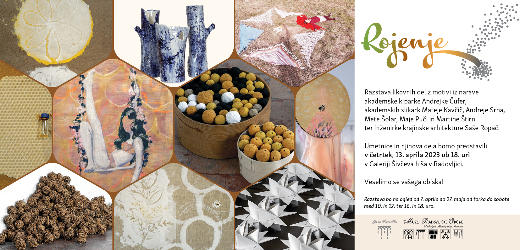 Vabilo na razstavo Rojenje, Galerija Šivčeva hiša, Radovljica Posted by mateja.kavcic S čebelami se povezujemo: Andrejka Čufer, Mateja Kavčič, Andreja Srna, Meta Šolar, Maja Pučl, Martina Štirn in Saša Ropač. Lepo vabljeni na ogled od 7. 4. do 27. 5. 2023 od torka do sobote, med 10. in 12. ter 16. in 18. uro. Deli: Click to share on X (Opens in new window) X Click to share on Facebook (Opens in new window) Facebook Povezano