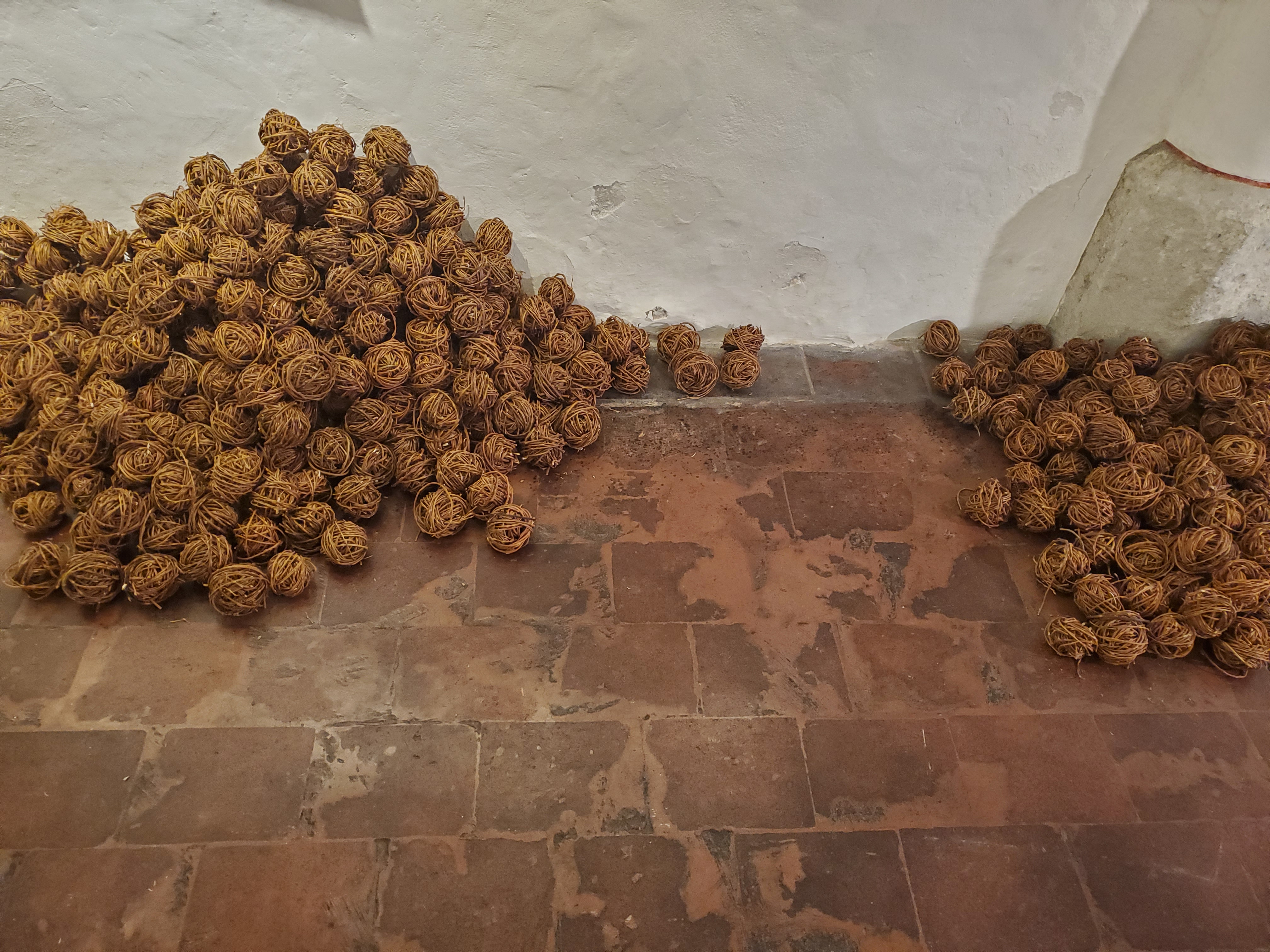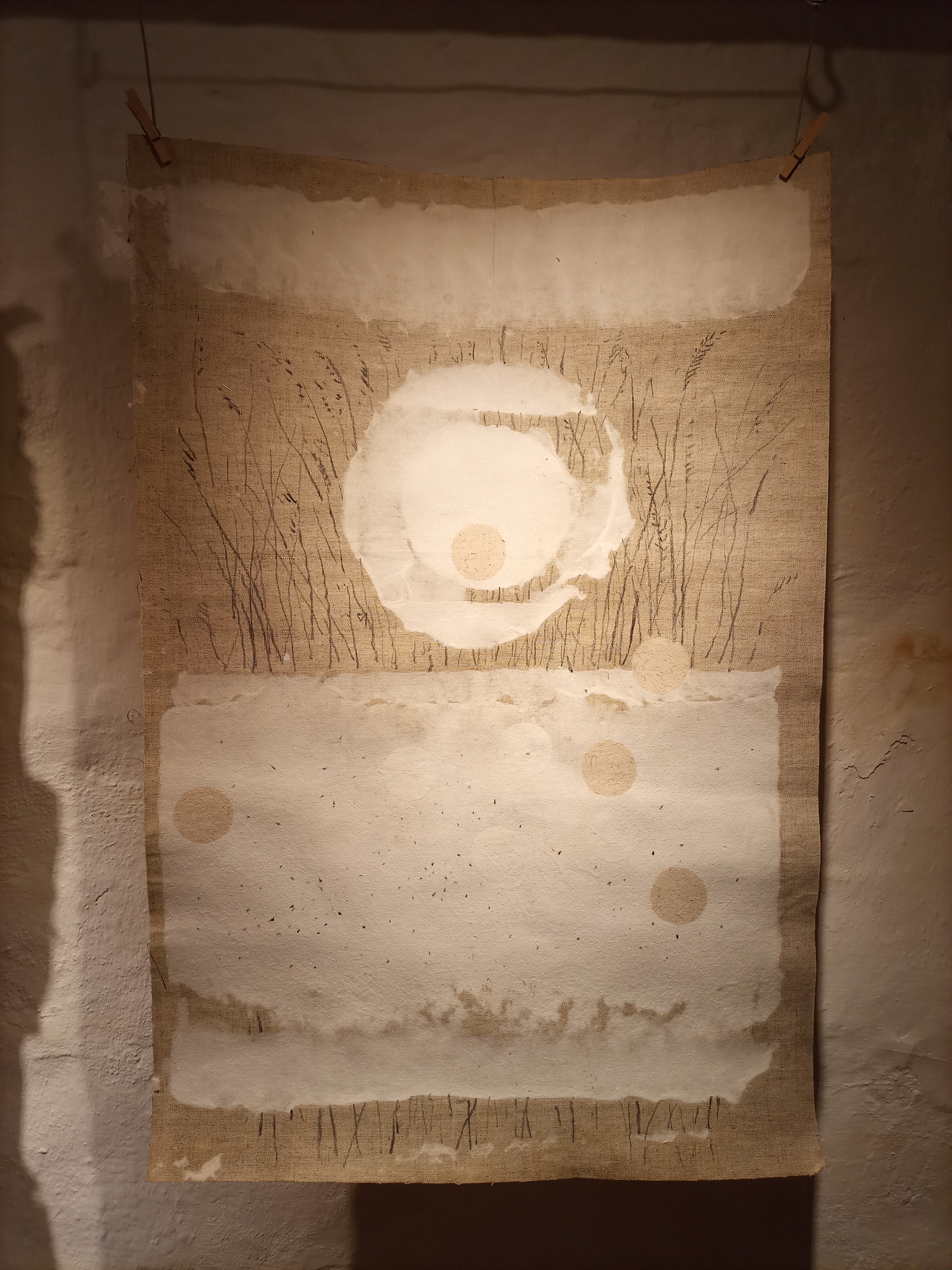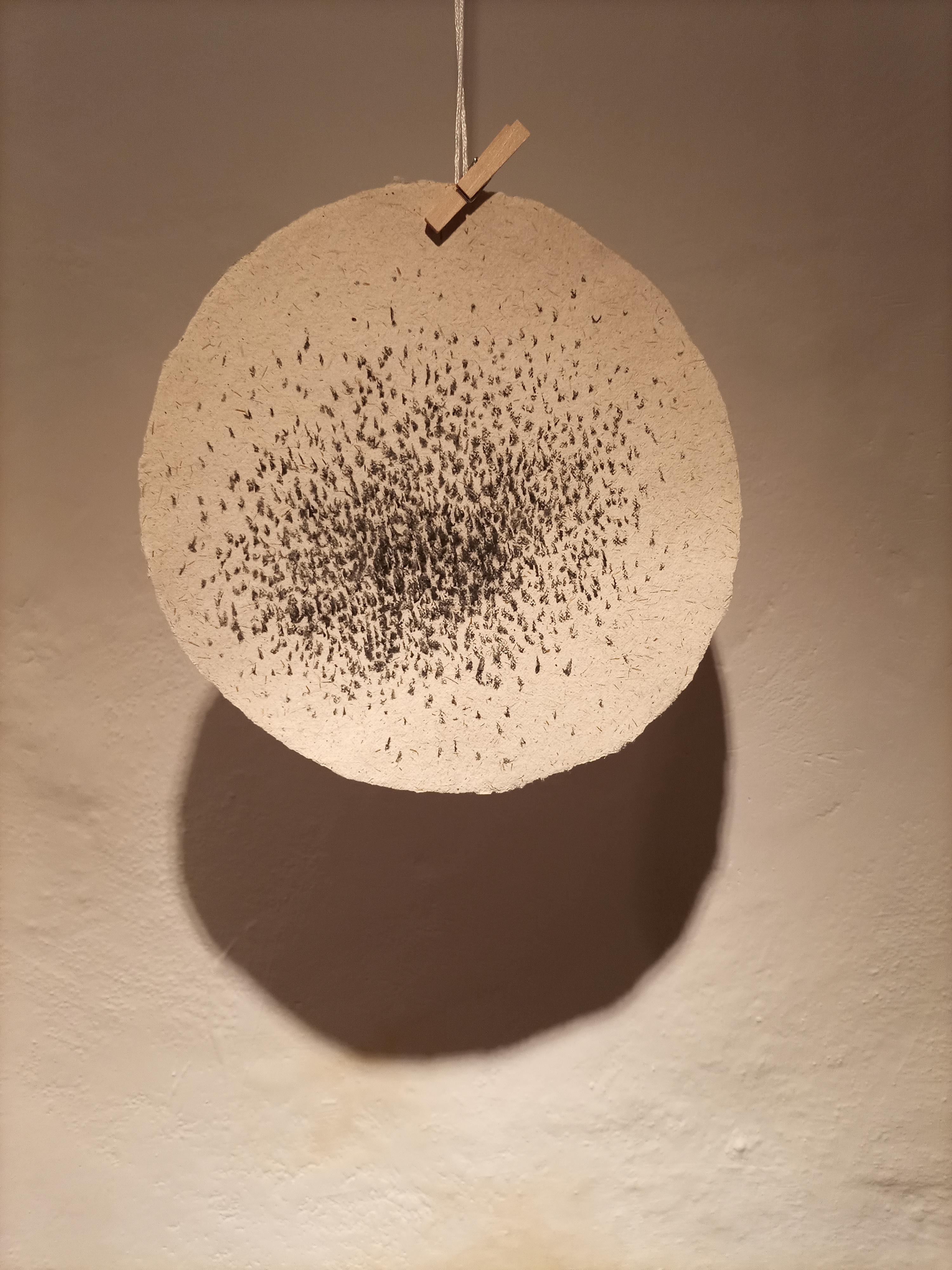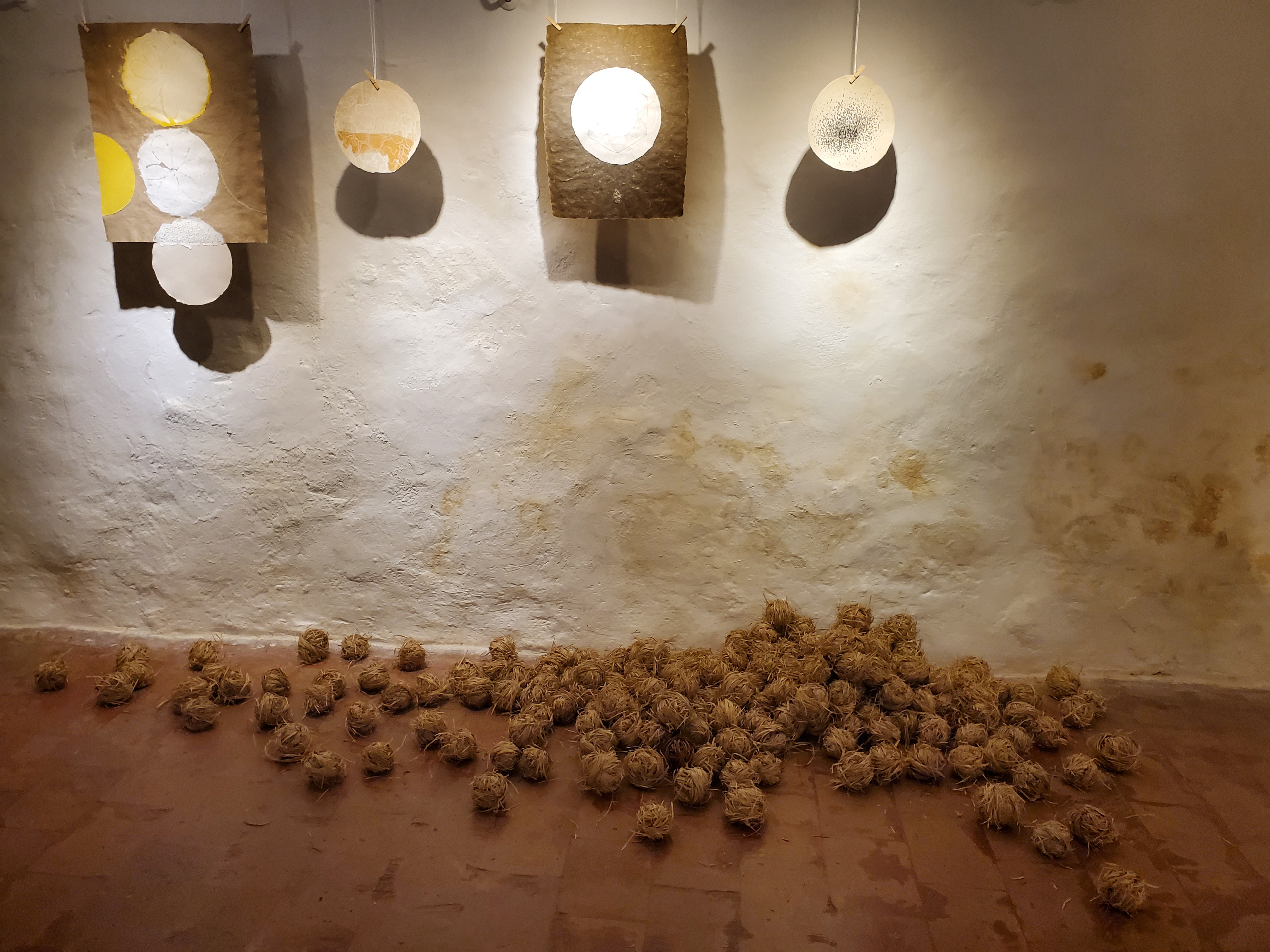 Rojenje – kupi kroglic iz vrbovih vejic in suhih gozdnih trav; zadnji dve fotografiji: ročno izdelan papir, kaširan na laneno platno – Maja Pučl in Andrejka Čufer + moja intervencija – risba z ogljem