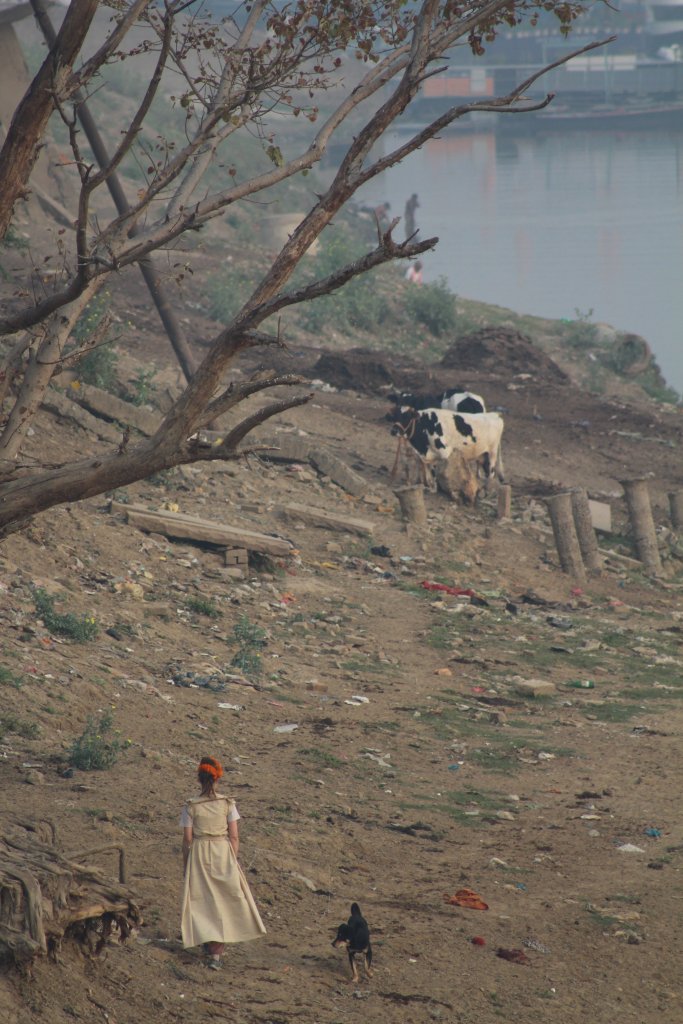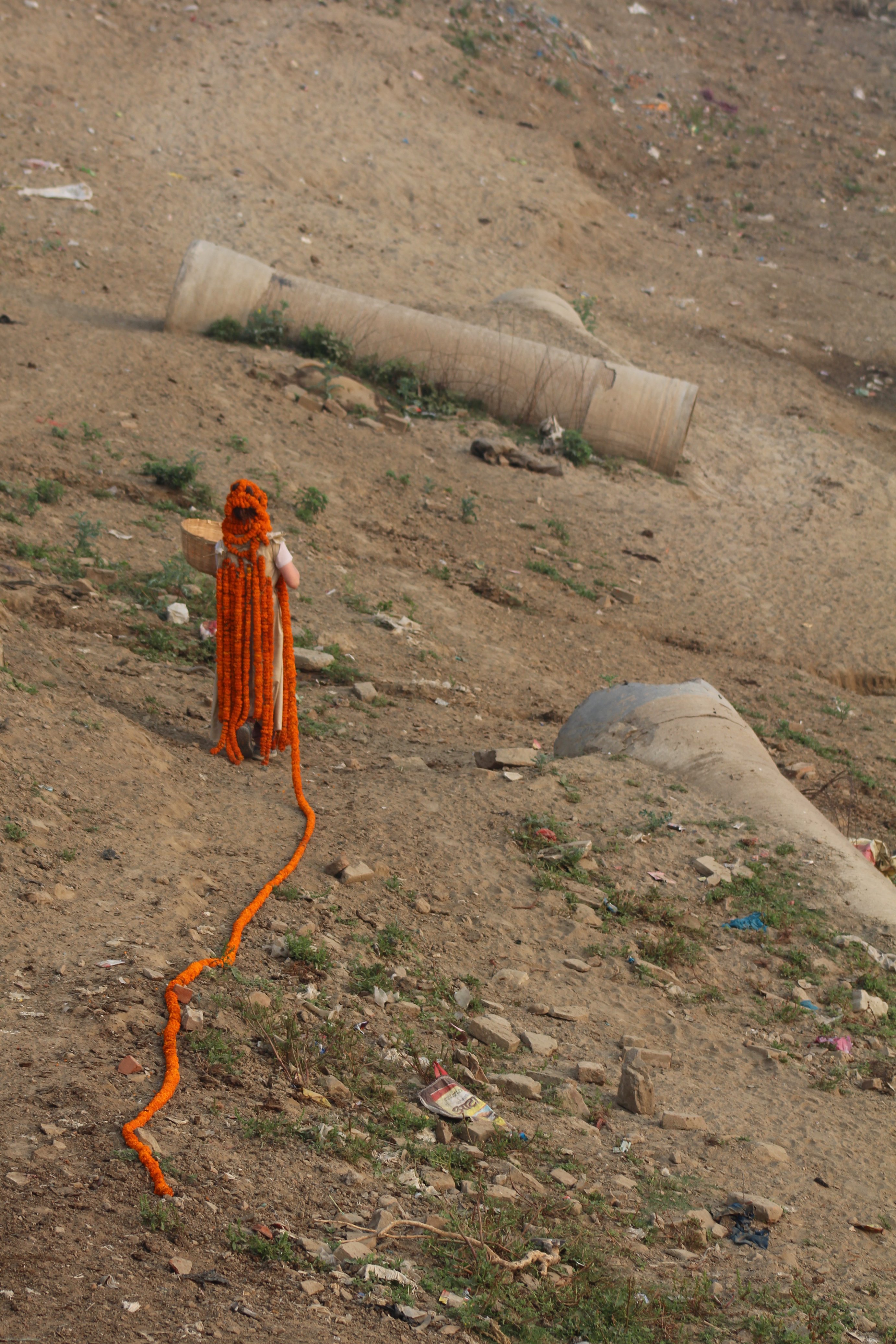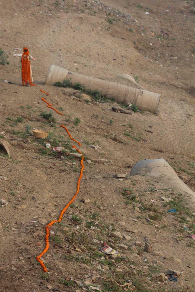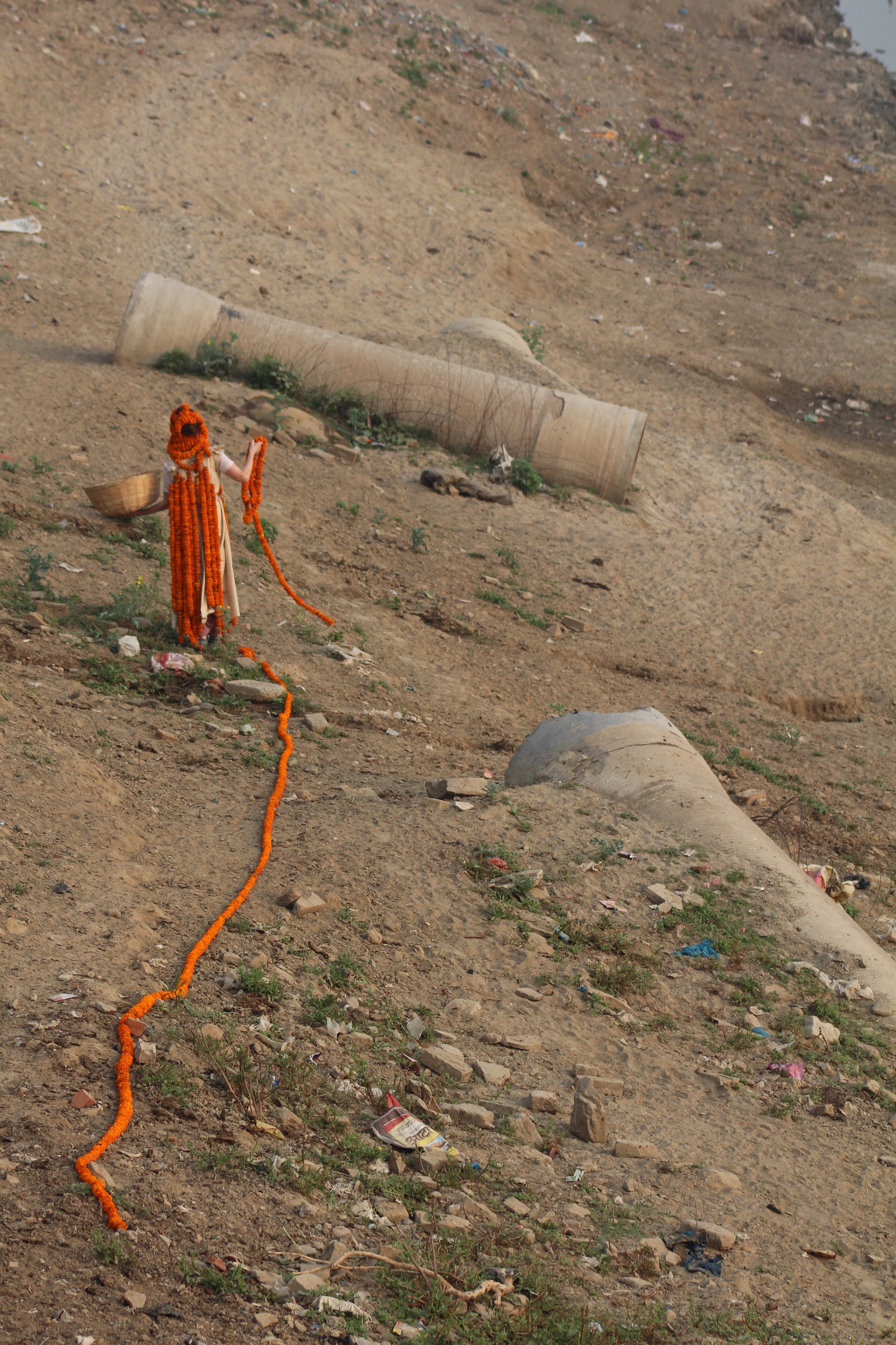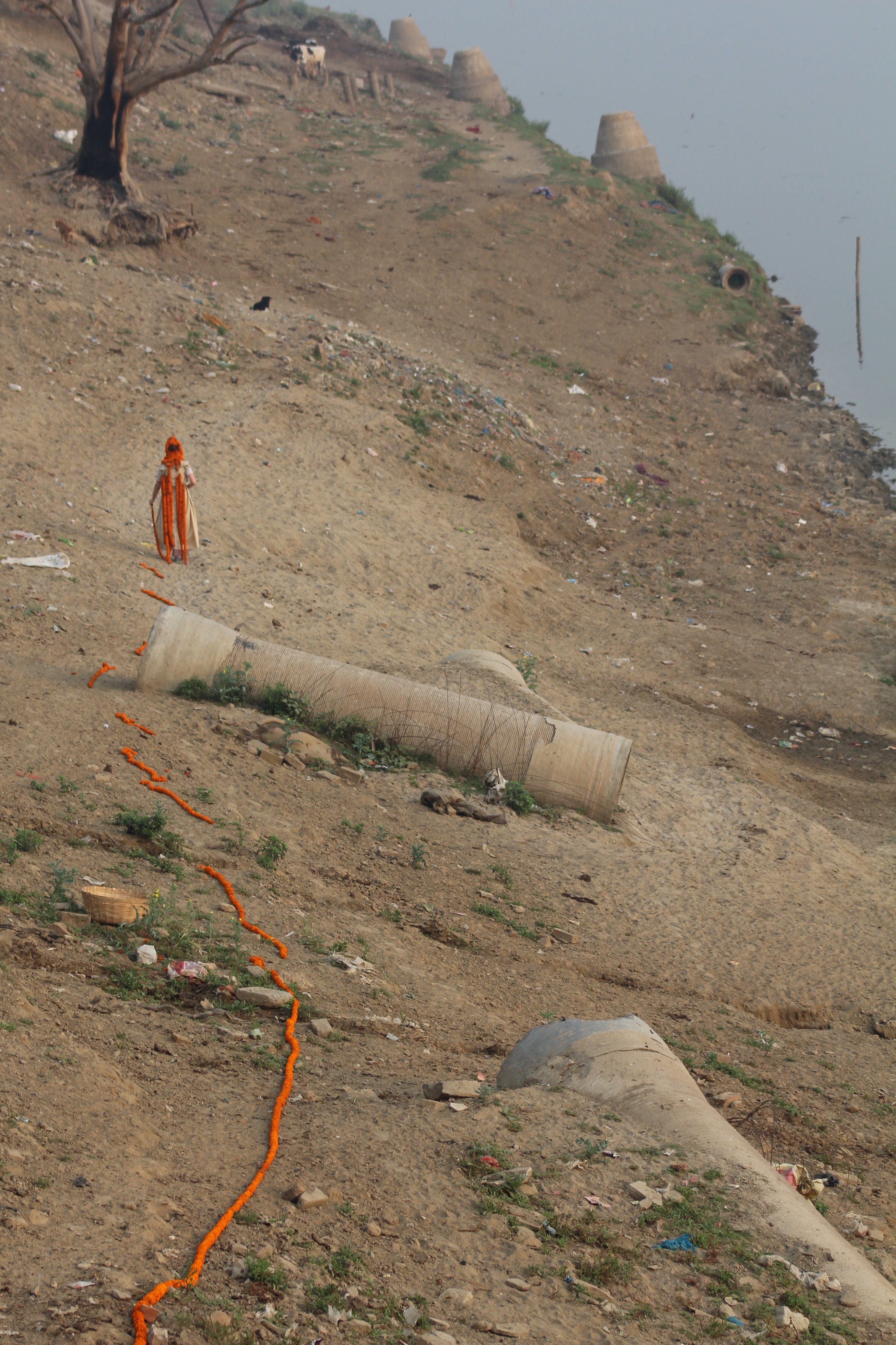 Performans na bregu reke Ganges “Leaving everything behind”; za sabo sem puščala minljivo oranžno sled iz cvetov, dokler nisem izginila v daljavi in se zlila s peščenim ozadjem. Živo oranžne rože Marigold so značilne za Indijo, uporabljajo jih ob praznovanjih in ko se poslavljajo od mrtvih..