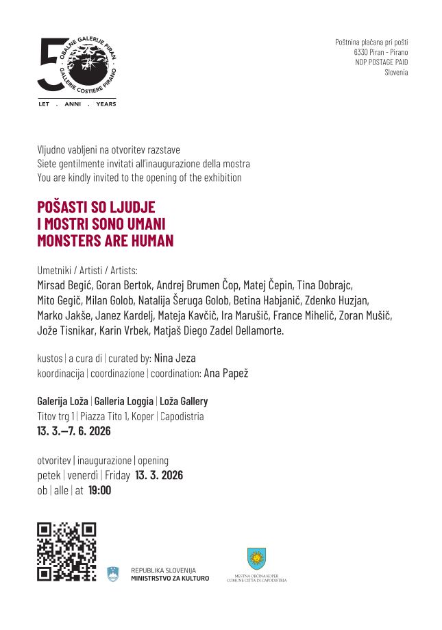 Vabilo na skupinsko razstavo v Galeriji Loža, Koper Posted by mateja.kavcic Razstava, ki jo je kurirala Nina Jeza, bo odprta med 13. 3. in 7. 6. 2026. Lepo vabljeni! Deli: Share on X (Opens in new window) X Share on Facebook (Opens in new window) Facebook Povezano