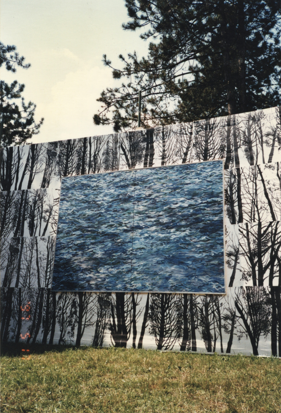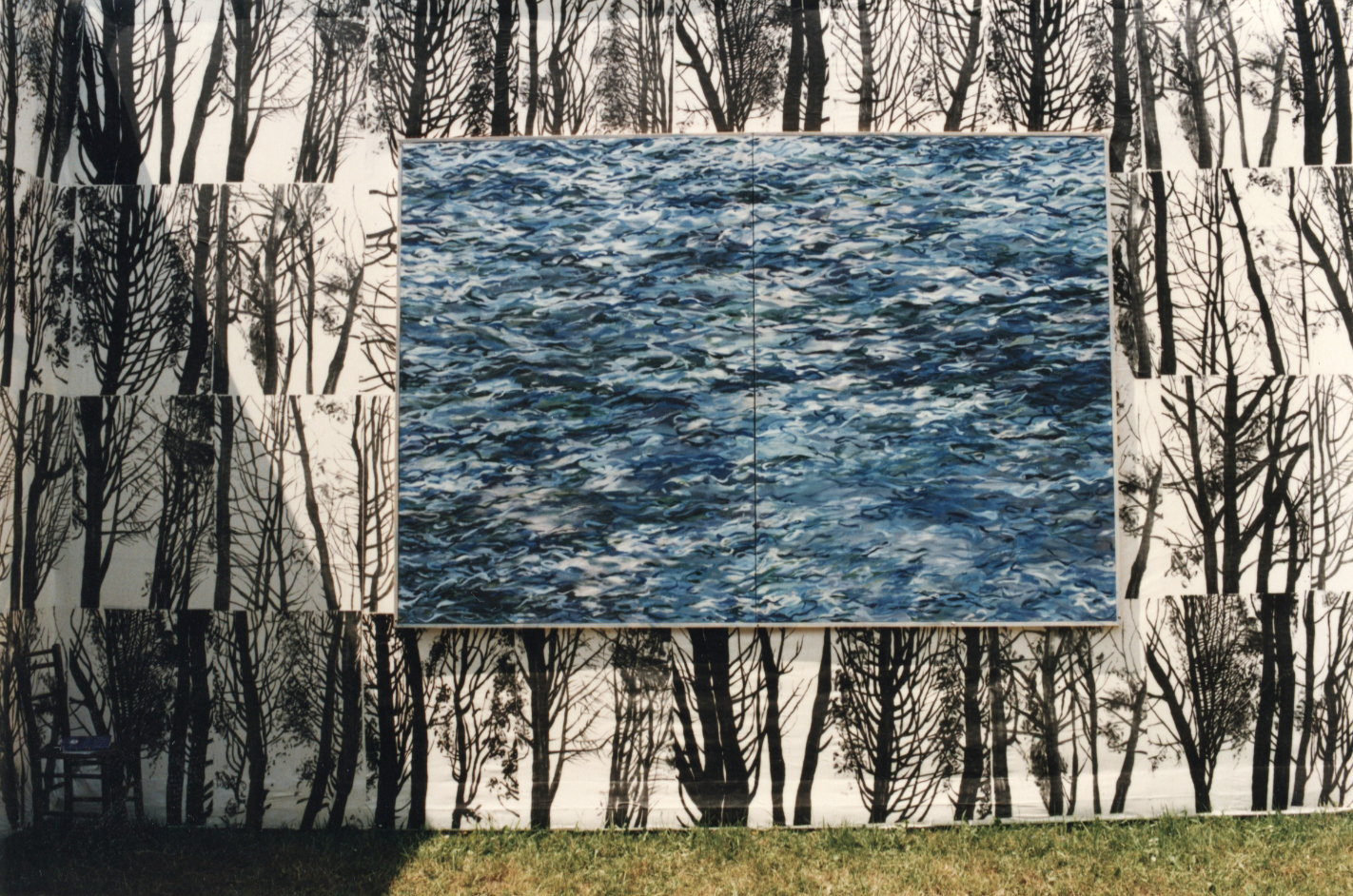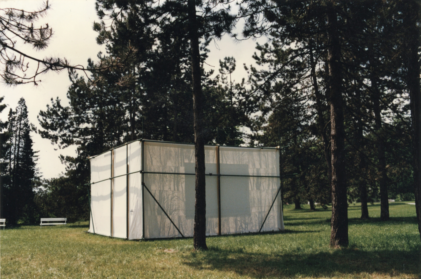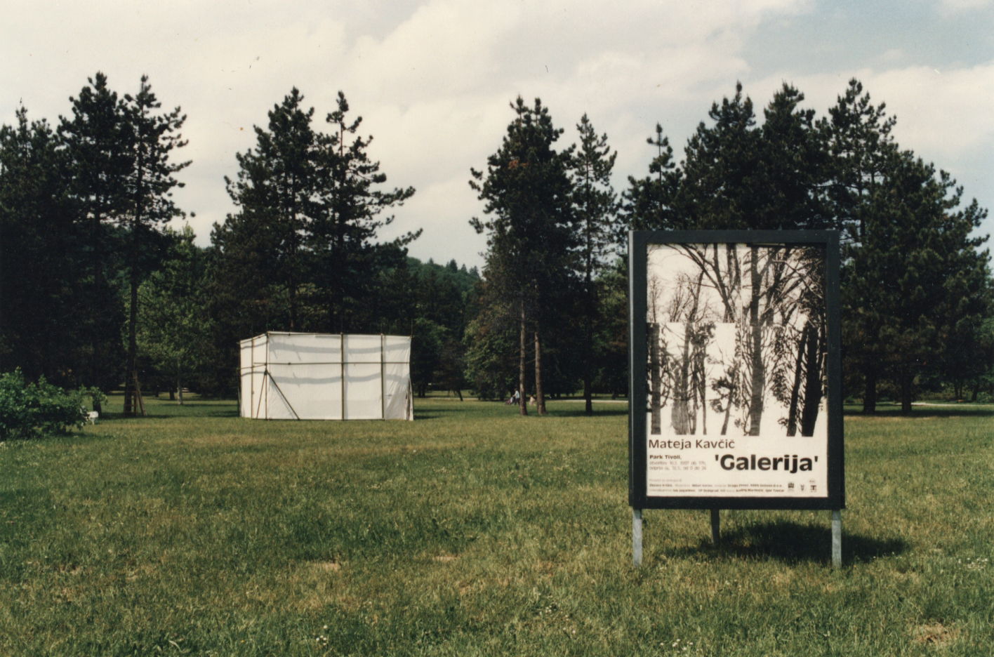 Prvič sem postavila “Galerijo“ na prostem v parku Tivoli l. 1997. Takrat sem na njene platnene stene obesila velike slike štirih praprvin. Želela sem, da gledalec pod nogami čuti zemljo, nad glavo nebo, da živost narave soustvarja razstavo in jo neprestano spreminja.