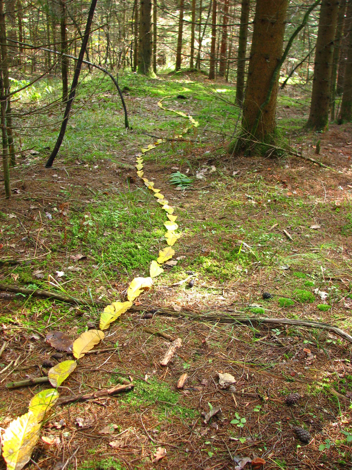 V zadnjih letih sem se tudi konkretno začela ukvarjati z ustvarjanjem na prostem in “sodelovanjem” z naravo. Nastajajo intimne “Razstave za ptice in naključnega sprehajalca”. Hitro minljive postavitve so sestavljene iz materialov najdenih v naravi (odpadlo listje, cvetovi in plodovi dreves, odtisi prstov v snegu) … V teh intervencijah se kot akterka popolnoma zlijem z naravo, sem dobesedno njen košček, kar mi daje posebno zadovoljstvo in občutek izpolnitve.